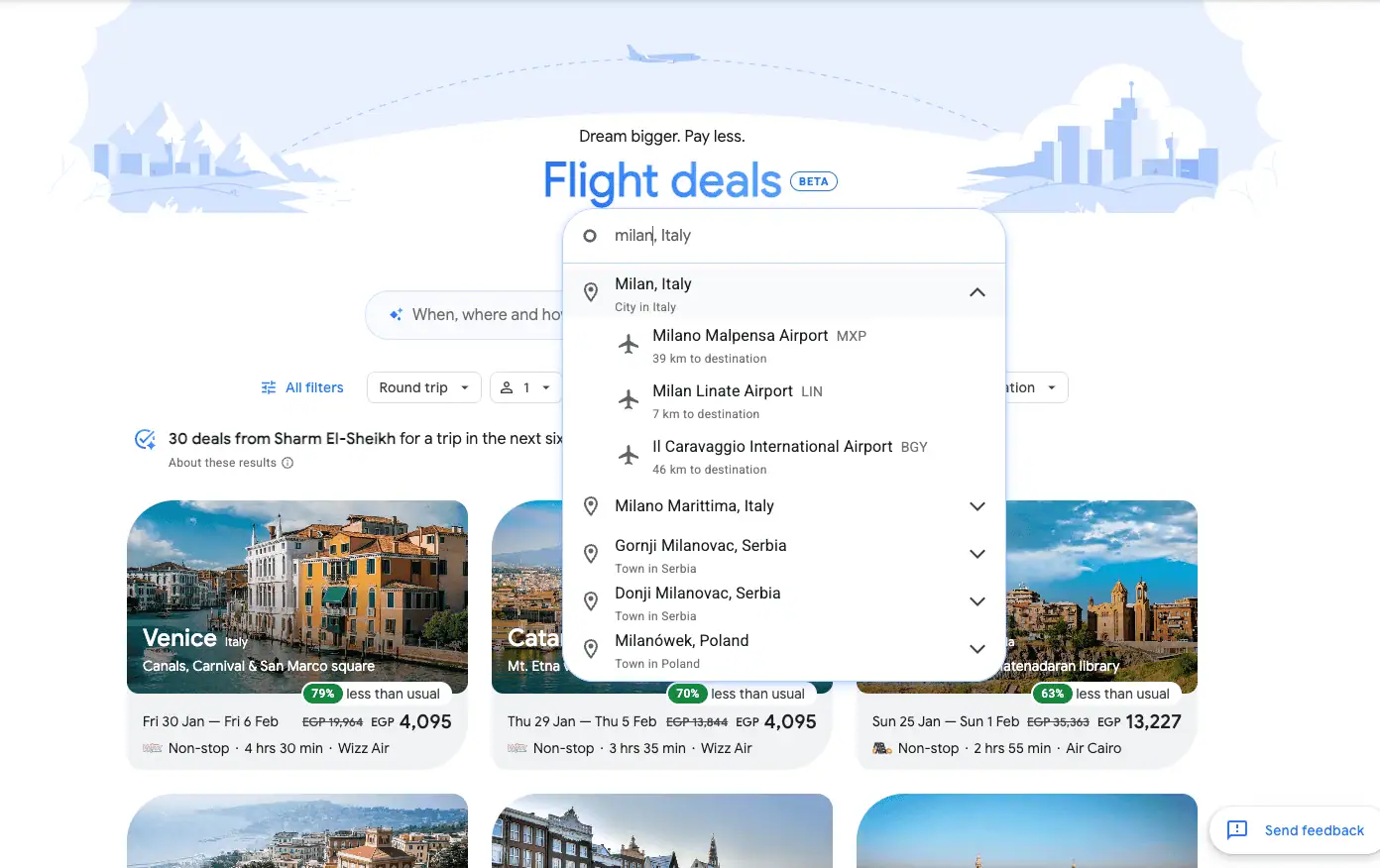 Apri la pagina di Google flights Deals. Vedrai in alto un menu’ dove puoi scegliere la citta’ da cui vuoi partire. Selezioniamo la città di partenza, nel nostro esempio Milano.