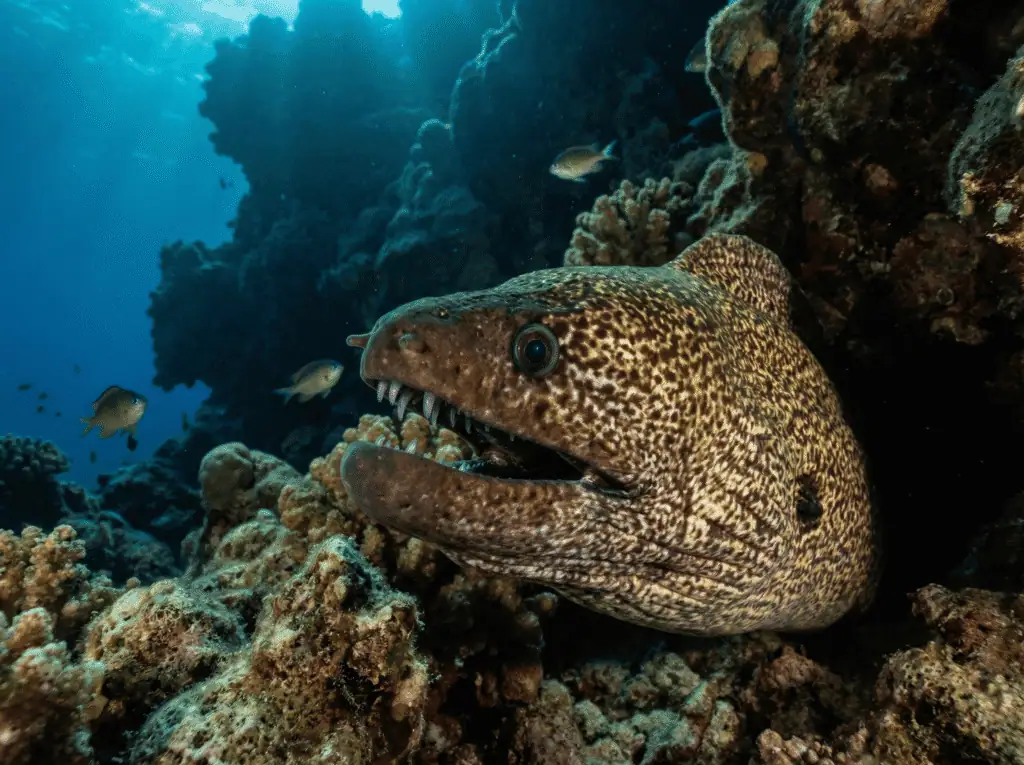 Le murene hanno denti rivolti verso l’interno — una volta chiuse le mascelle, più cerchi di staccarle più i denti penetrano. Le ferite si infettano facilmente perché la loro saliva contiene batteri aggressivi.