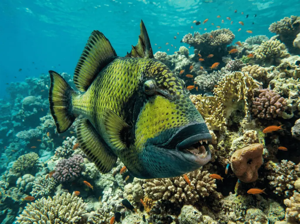 Questo è il pesce che i subacquei temono più degli squali. Davvero. Il pesce balestra titano raggiunge i 75 cm, ha denti progettati per frantumare ricci di mare e gusci di molluschi, e durante la stagione riproduttiva diventa brutalmente territoriale.