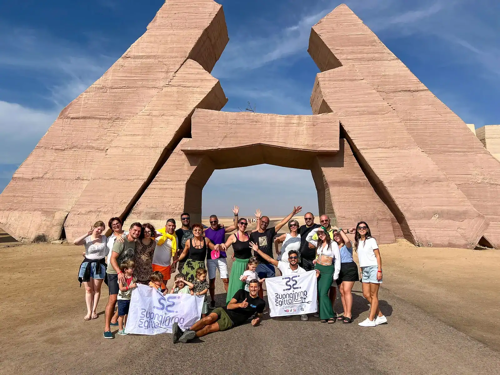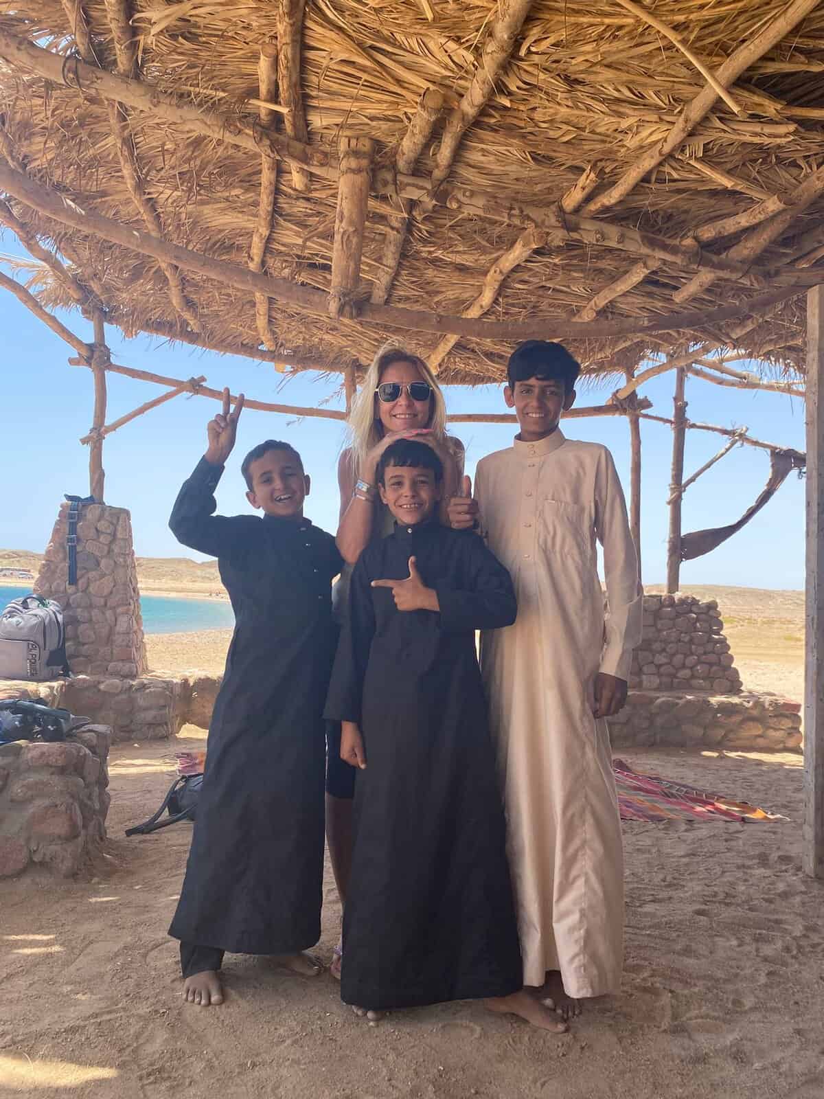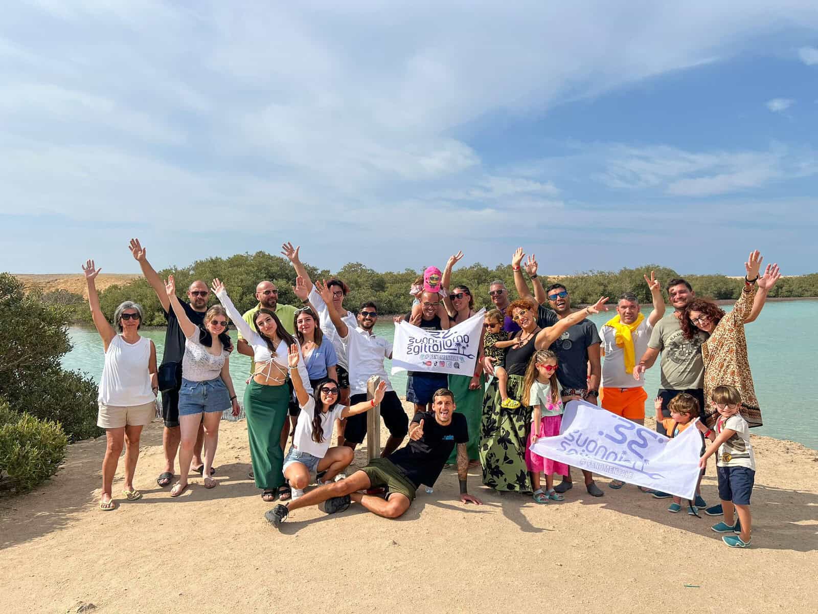 gruppo di italiani salutano mentre bambini tengono la bandiera di buongiorno egitto al canale delle mangrove di ras mohammed