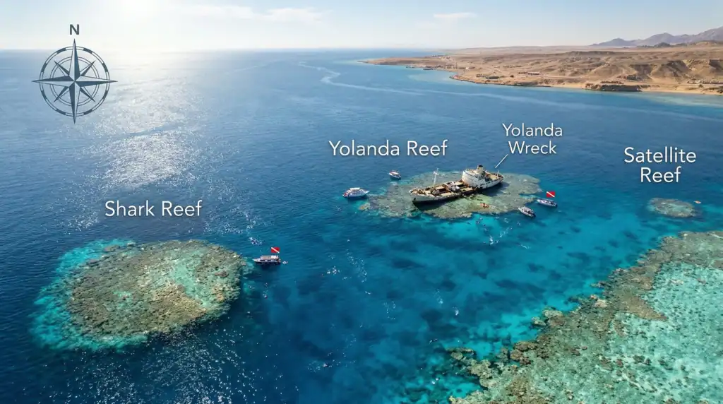 Proprio davanti al Promontorio degli squali ci sono 3 isolotti con una fauna e flora marina ricchissime, votati tra i 10 punti al mondo migliori per fare immersione. Si trovano proprio dove si incontrano le acque del Golfo di Aqaba con le acque del Golfo di Suez: le forti correnti e l’ incontro di questi 2 mari fa si che ci sia gran passaggio di pesci e nutrienti.